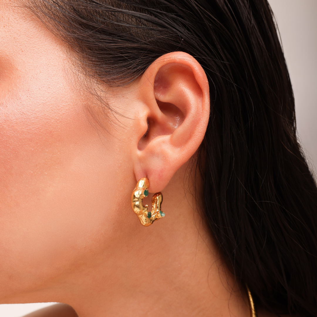 Aretes multiformes de textura escultórica, con acabado dorado y esmeraldas en bruto incrustadas que conservan su forma natural. Cada par es único.